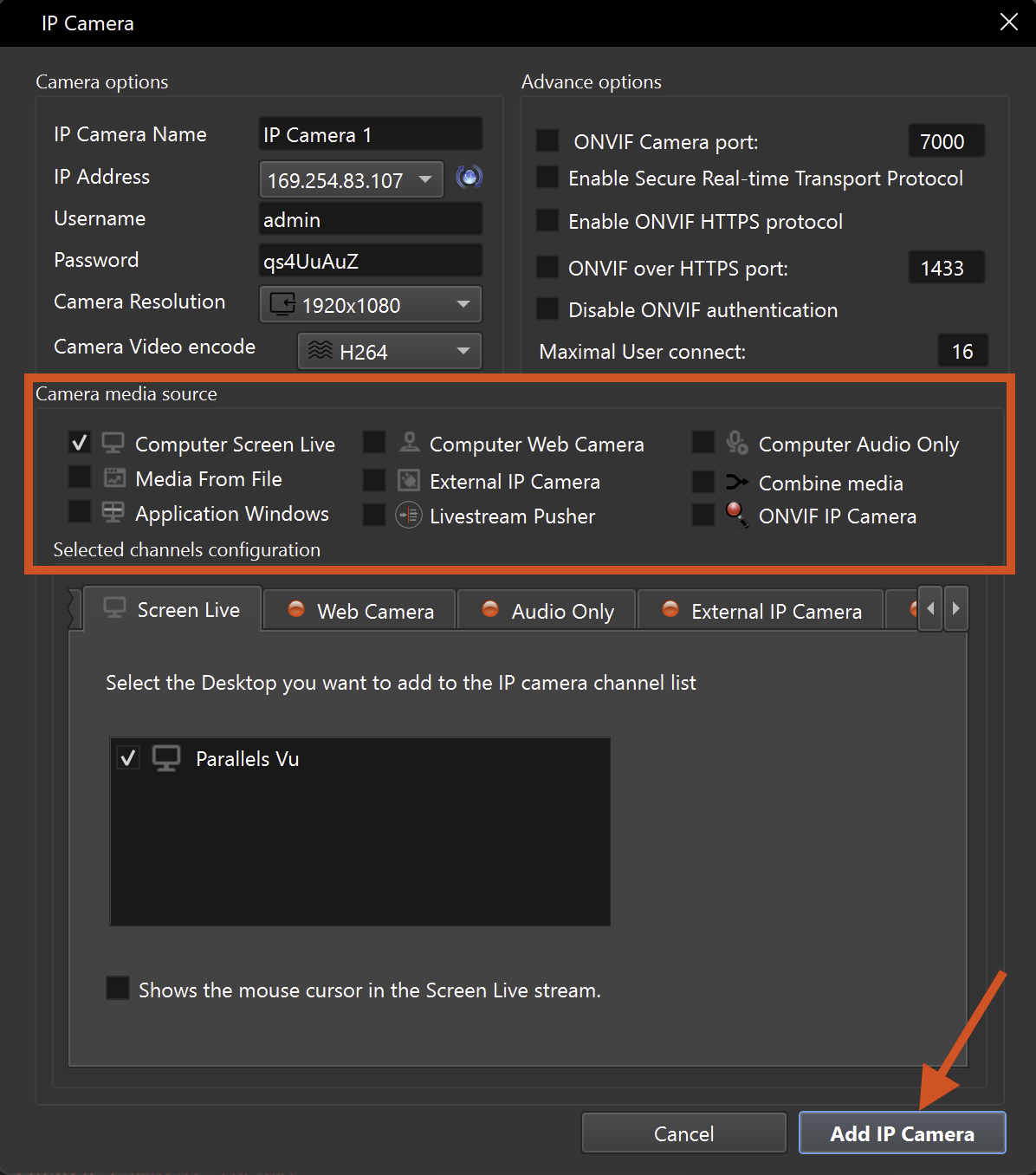 The Camera Media Source defines what content is streamed by the virtual IP camera.