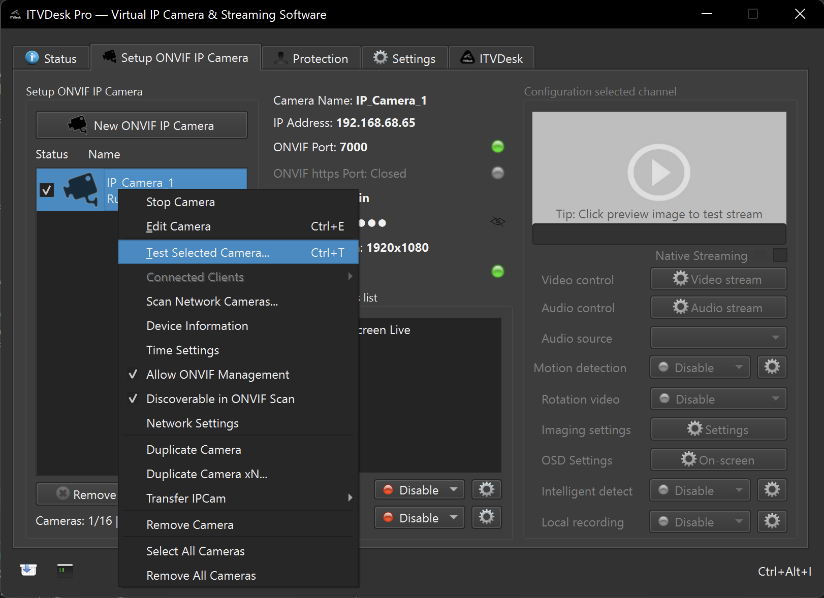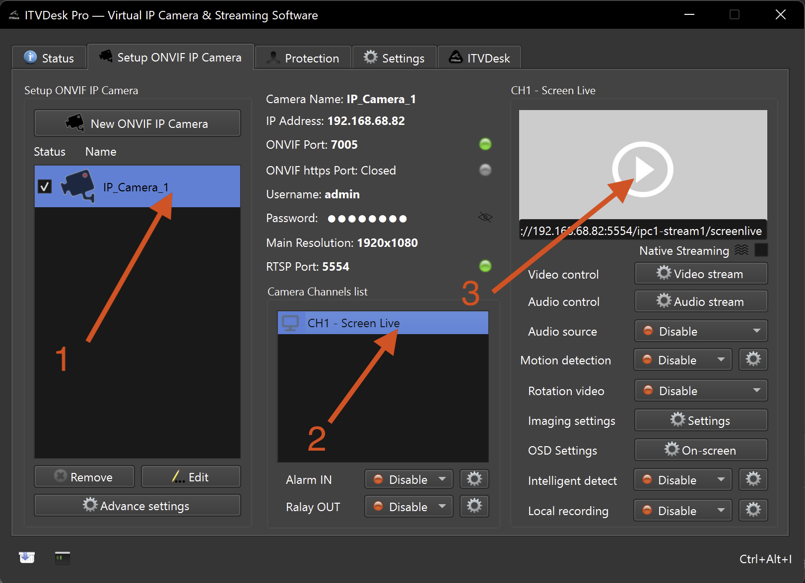 Before ITVDesk can function as a virtual ONVIF IP camera, at least one IP camera configuration and video source must be created.