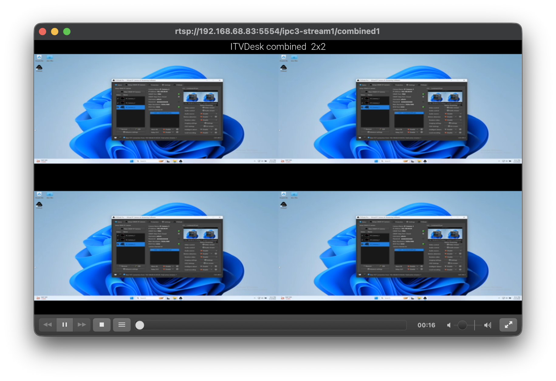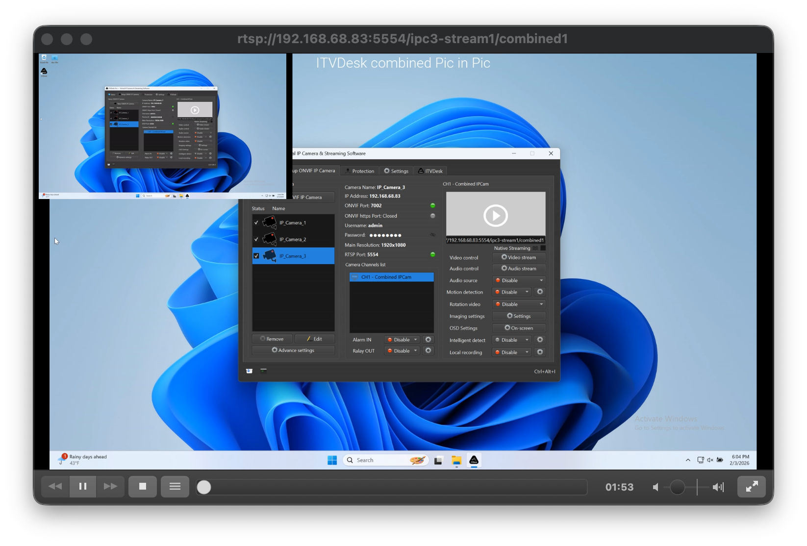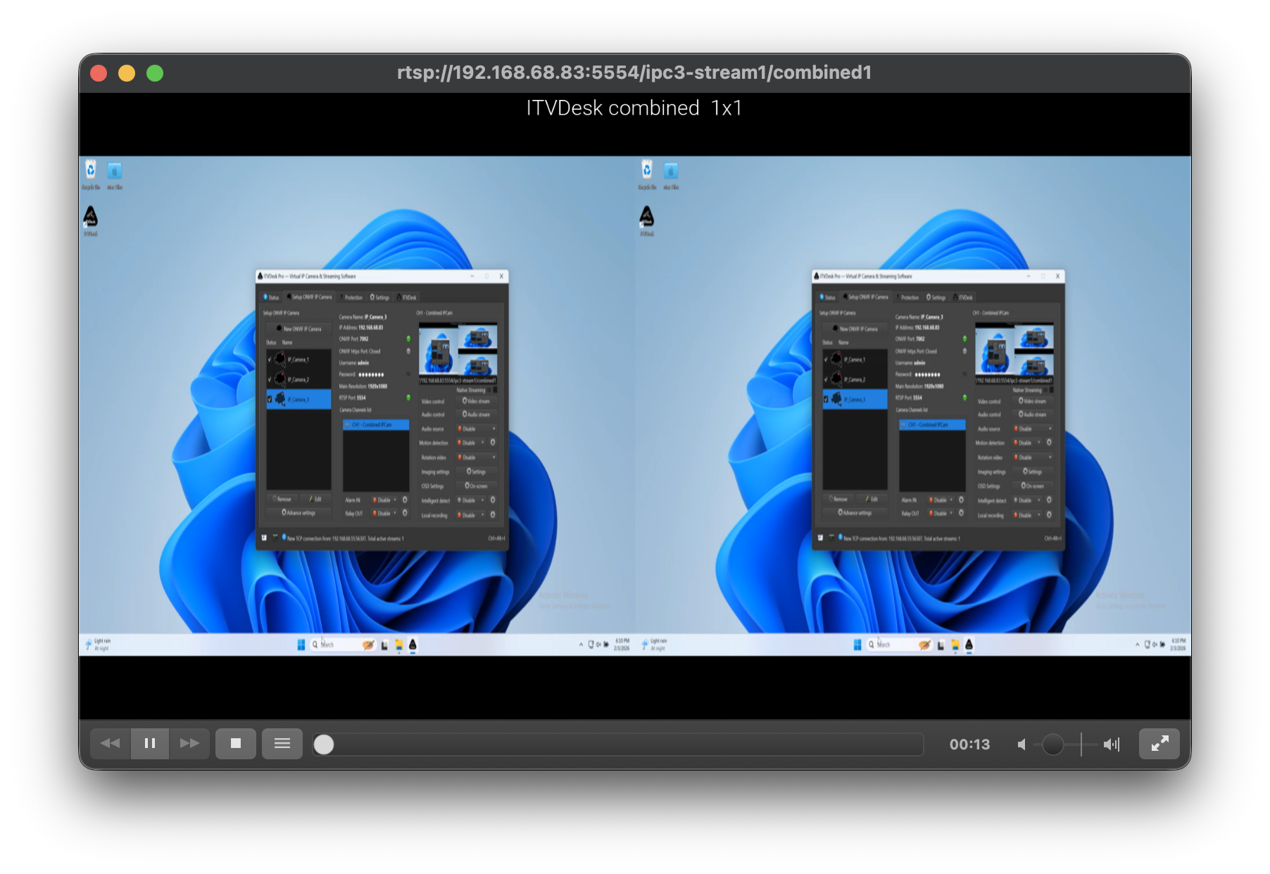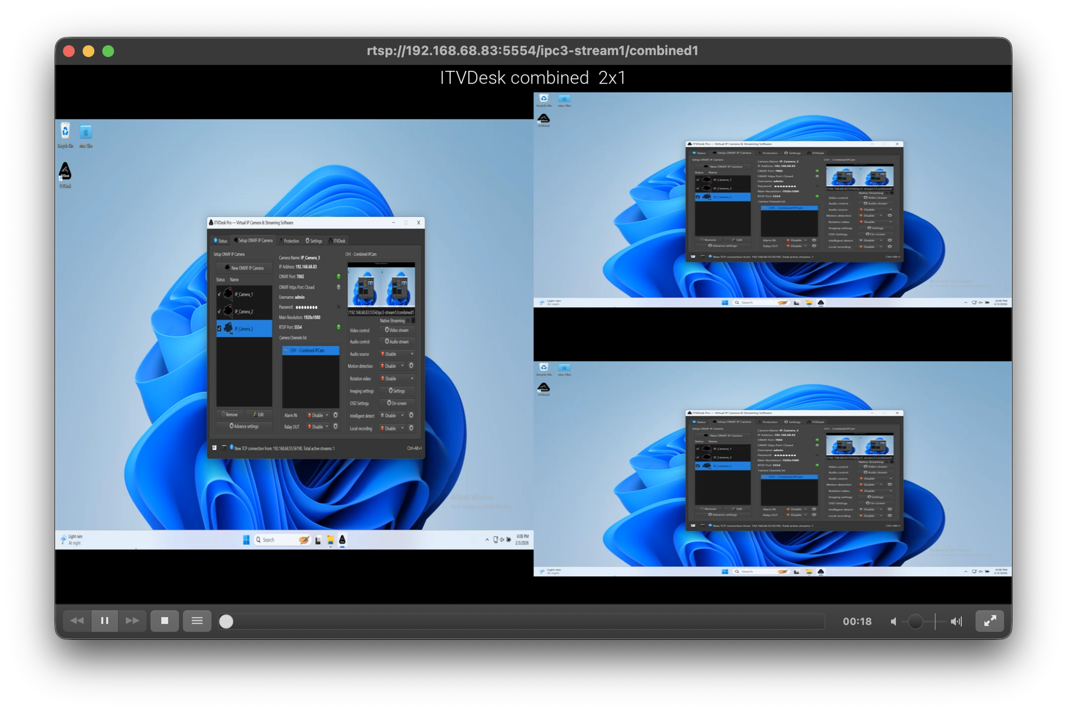 Combined Media Stream allows ITVDesk to merge multiple video and audio sources into a single video stream that is exposed as one virtual ONVIF IP camera channel.