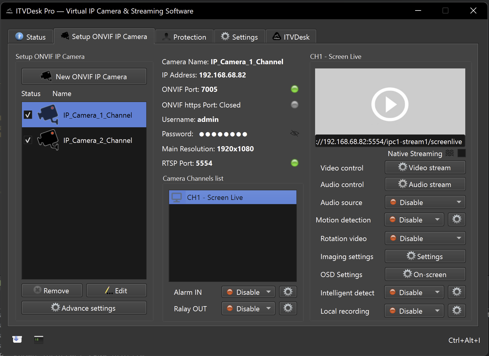 - Displays all configured virtual ONVIF IP cameras