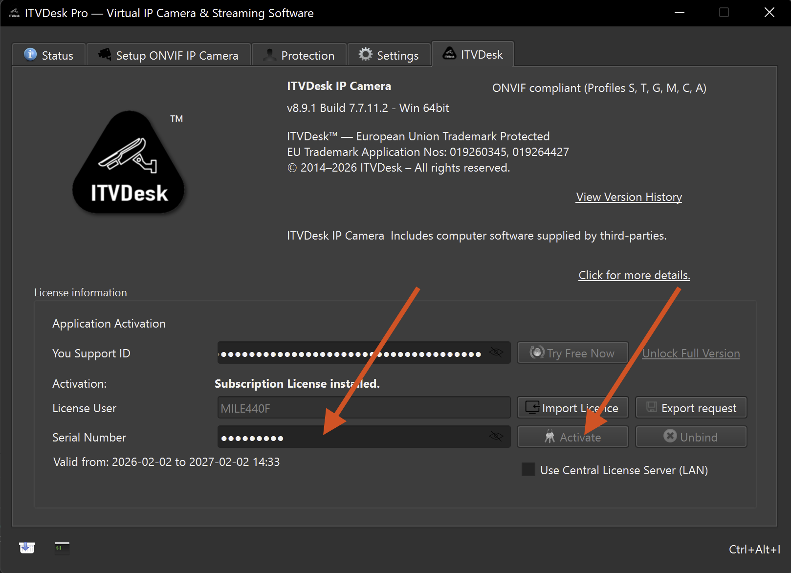 - Open the License / Activation dialog
