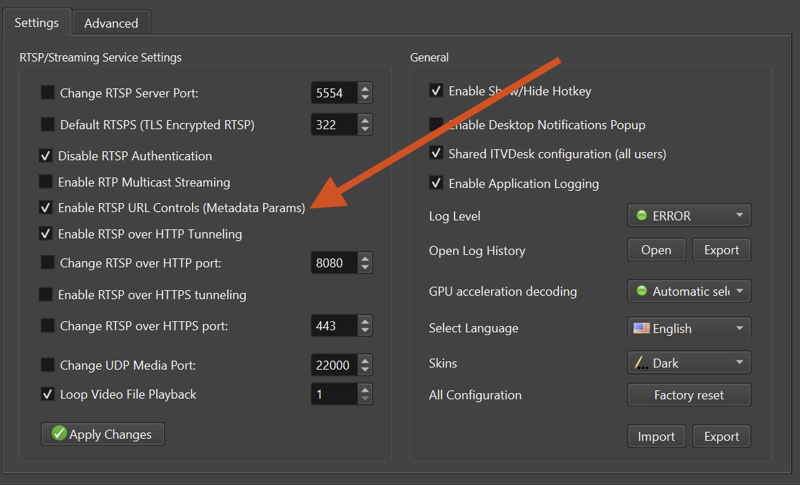 The ITVDesk media server supports dynamic stream configuration using RTSP URL query parameters.