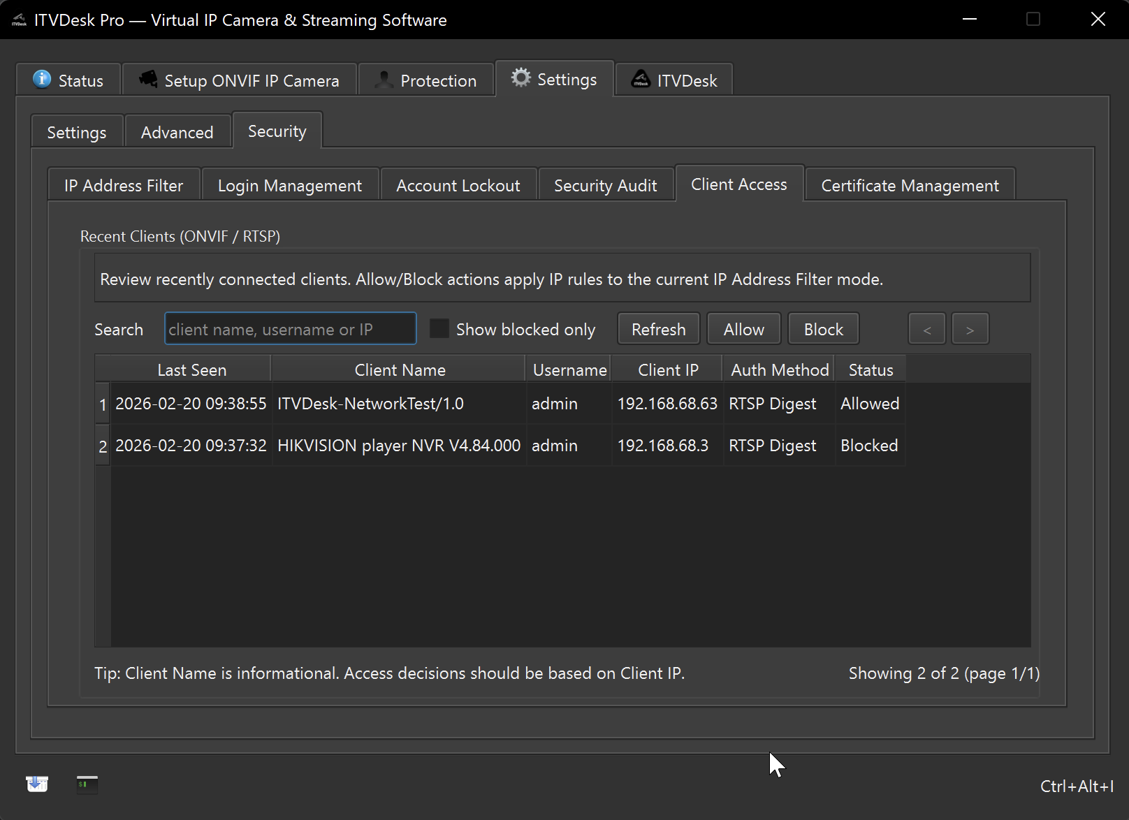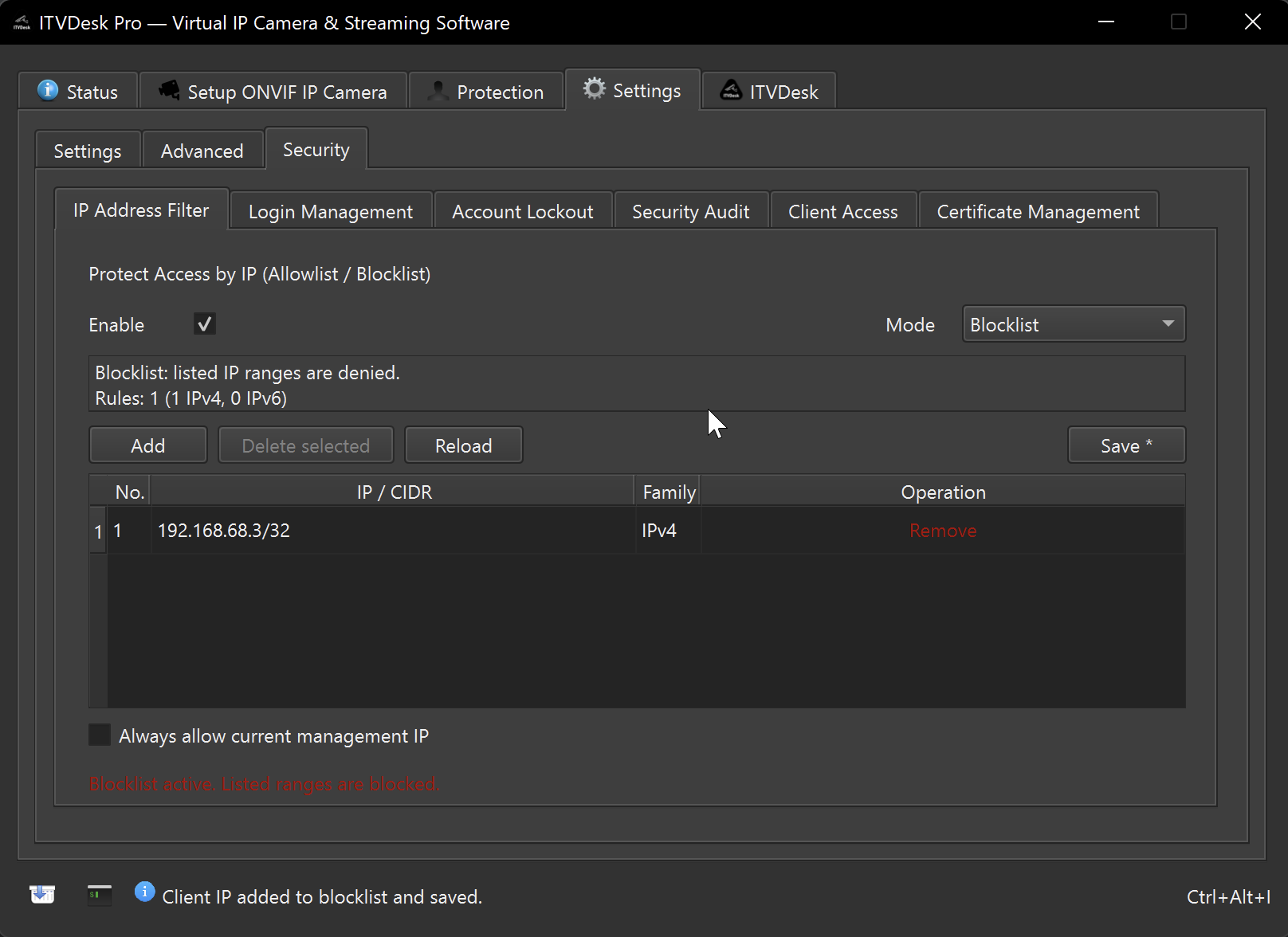 ITVDesk provides an IP Address Filter to control which client IP addresses are allowed to connect to a virtual IP camera (ONVIF/RTSP).