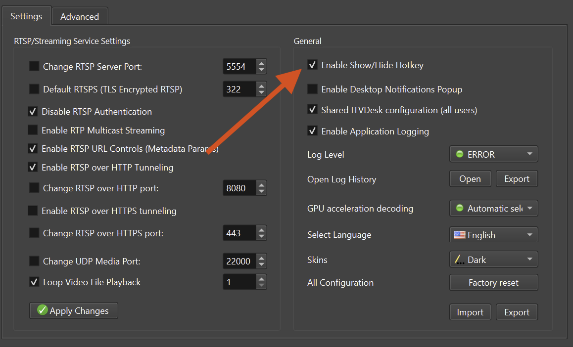 Allows showing or hiding the ITVDesk window using a keyboard shortcut.