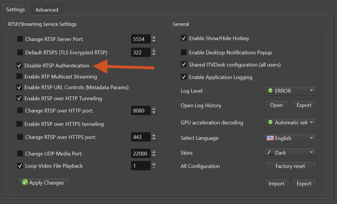 ITVDesk uses RTSP port 5554 by default instead of the standard 554.