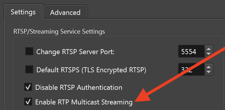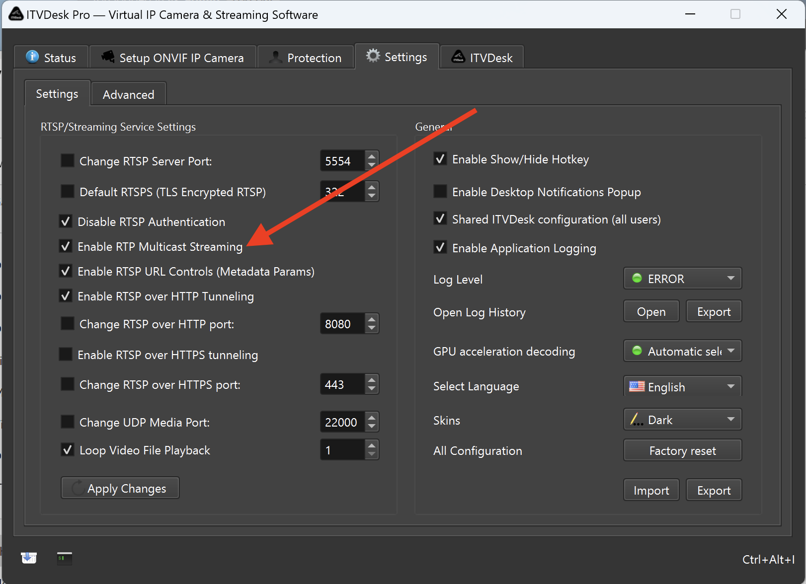 To enable RTP multicast streaming, the multicast option must be enabled in ITVDesk Settings (Streaming Service Settings).