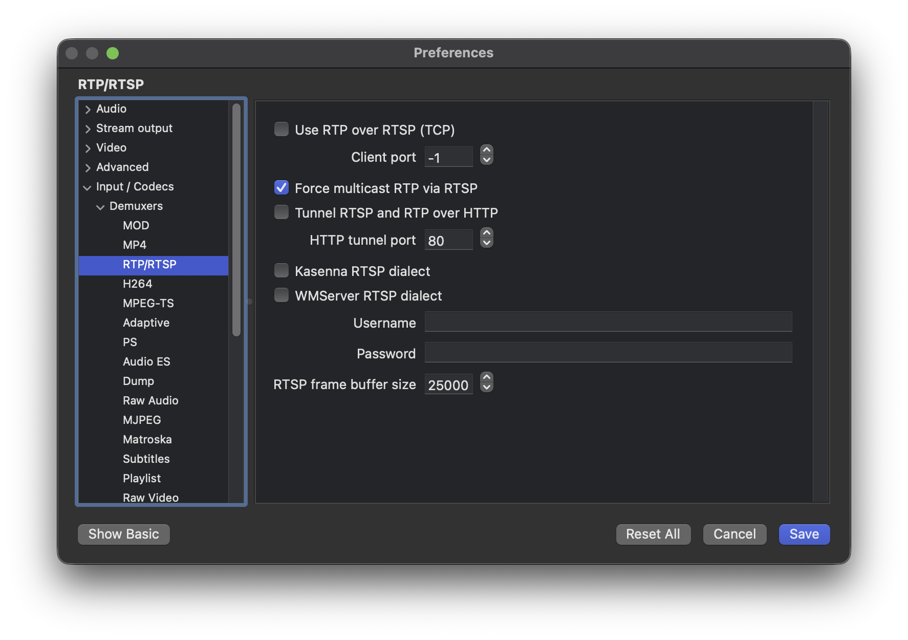 Open the stream using the standard RTSP URL. Use VLC to test RTP multicast with the following settings:
